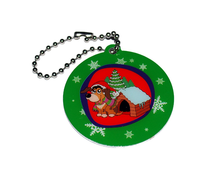 Den är gjord av aluminum och är ca. 4,5 centimeter. Den har även en liten kedja så att den går att fästa i andra saker.