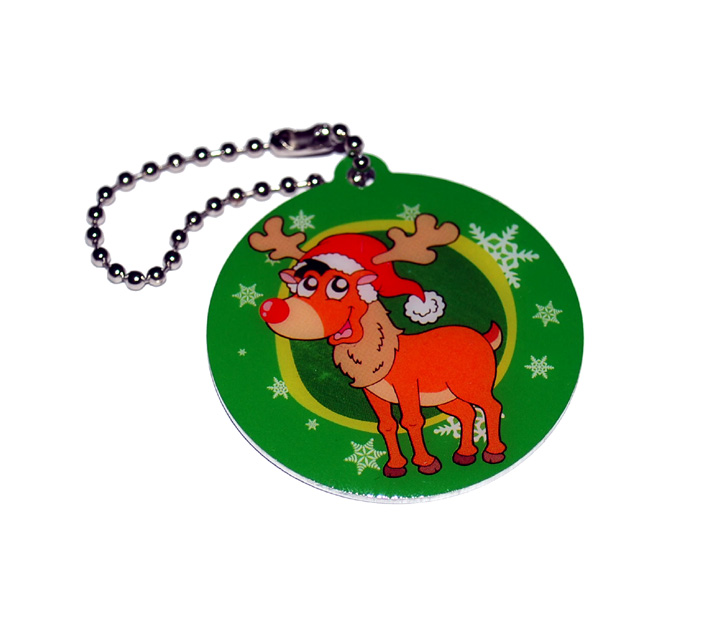 Den är gjord av aluminum och är ca. 4,5 centimeter. Den har även en liten kedja så att den går att fästa i andra saker.